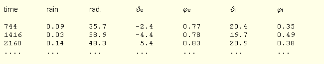 The climate file essentially consists of a table, with each line containing all required climate data (rain, radiation, exterior temperature, exterior relative humidity, interior temperature, interior relative humidity) for a certain interval of time.