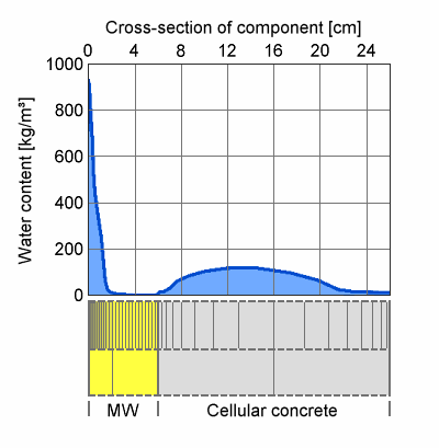 An impressive example of what kind of gradients may occur close to layer boundaries can be seen in the case of construction moisture drying out of a cellular concrete flat roof with mineral wool insulation. During the cold season, the moisture migrates up through the permeable mineral wool and condenses at the impermeable roof membrane in amounts that are not only a problem for the insulation quality but for the numerics as well. In such a case it is imperative to have very fine grid elements close to the roof membrane, while a relatively coarse grid is sufficient in the cellular concrete.