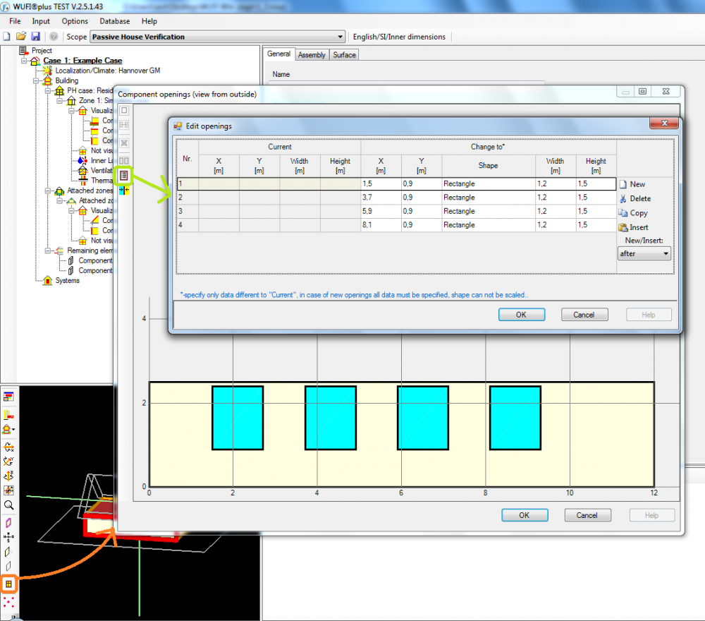 We will add 4 windows on the south facade using the visualization box in the bottom left corner. Click the orange boxed "Windows/openings" button and a new page will appear. Click the green boxed button "Edit List" and insert the windows as seen in the picture.