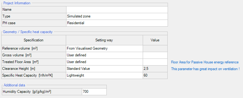 The Clearance Height is used to estimate the ventilation air volume and the Specific Heat Capacity is required to assess the buffering capability of the building.